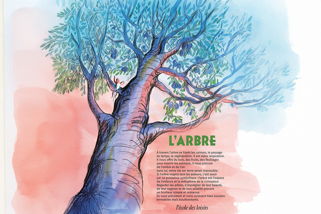 À travers l’arbre se lisent les saisons, le passage du temps, la régénération. Il est notre respiration. Il nous offre du bois, des fruits, des feuillages pour nourrir les animaux, il nous procure de l’ombre et de l’air. Sans lui, notre vie sur terre serait impossible. Une source d’inspiration que les auteurs en littérature jeunesse explorent et partagent avec nous. Vous retrouverez notamment les dessins d’albums publiés à l’école des loisirs : Jeanne Ashbé, Claude Ponti, Gerda Muller…